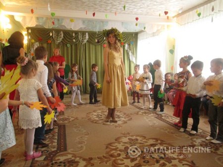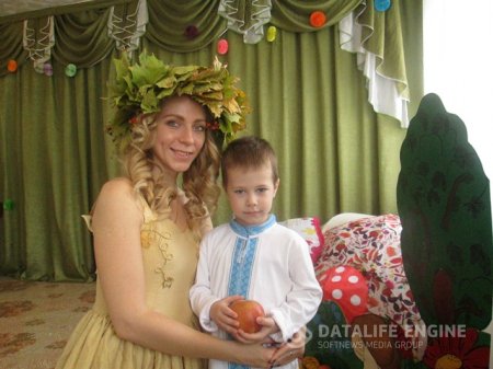 У розкішному платті, прикрашеному кленовим листям, завітала на свято до дітей Осінь. Здавалося, що ніби чарівник - художник «намалював своїм пензликом цю прекрасну дівчину. Зал став схожий на таємничий ліс з сірими хмарами, крапельками дощу та падаючого листя. Вся ця «картина» по справжньому стала прекрасним доповненням до всього, що відбувалося в залі, і створювала святкову атмосферу.